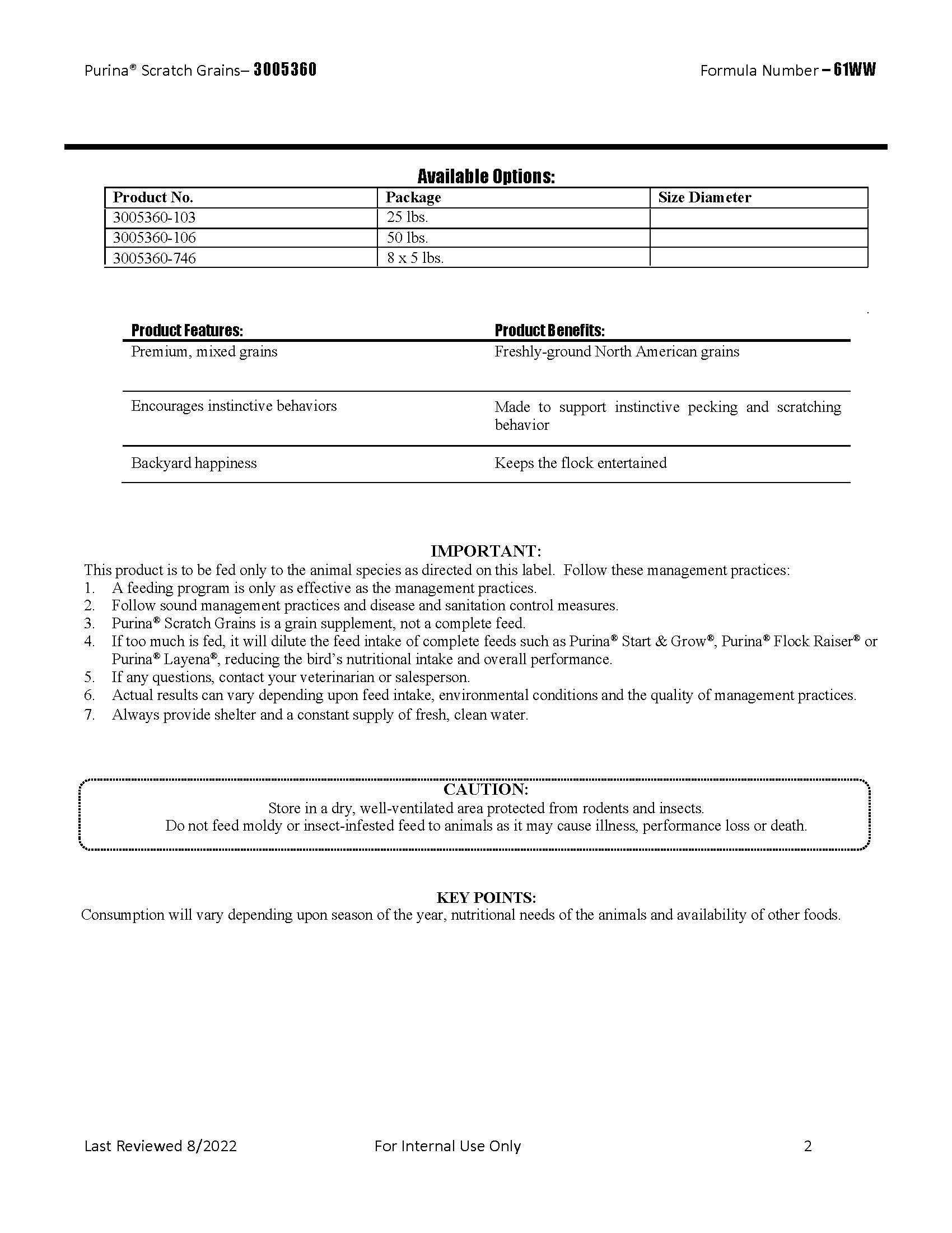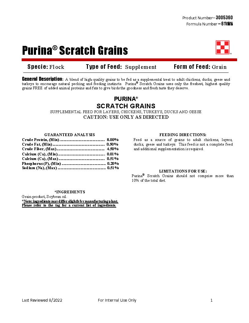 Purina® Scratch Grains are a blend of high-quality grains to complement complete feeds and encourage natural pecking foraging and feeding instincts. Purina® Scratch Grains can be fed as a supplemental treat to adult chickens, ducks, geese and turkeys.