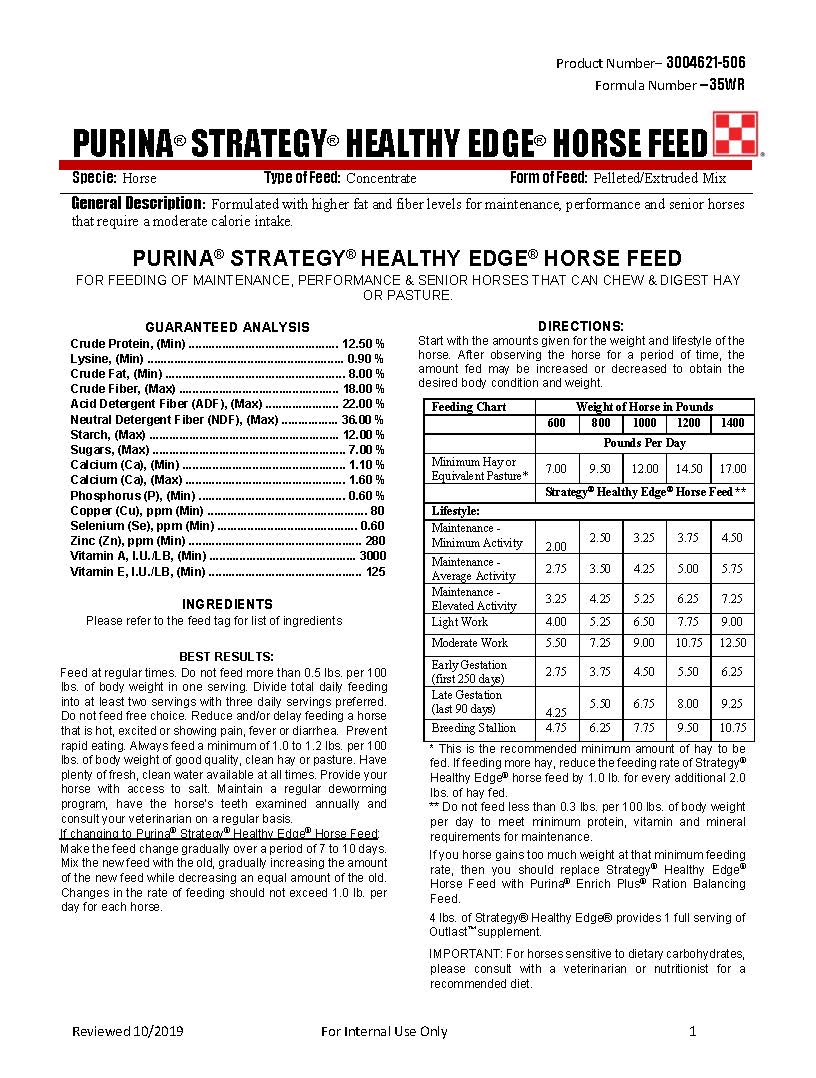 *With Outlast Gastric Support Supplement* For Maintenance, Performance and Senior Horses. Health inside and out. A nutritional edge. Two things every horse owner wants for their horse, and what Strategy® Healthy Edge® horse feed is designed to deliver. Nutrition that helps horses look amazing, feel great and perform at their best. Strategy® Healthy Edge® feed gives horses age 2 and older the nutritional edge needed to support nearly any lifestyle from recreation to performance to retirement.