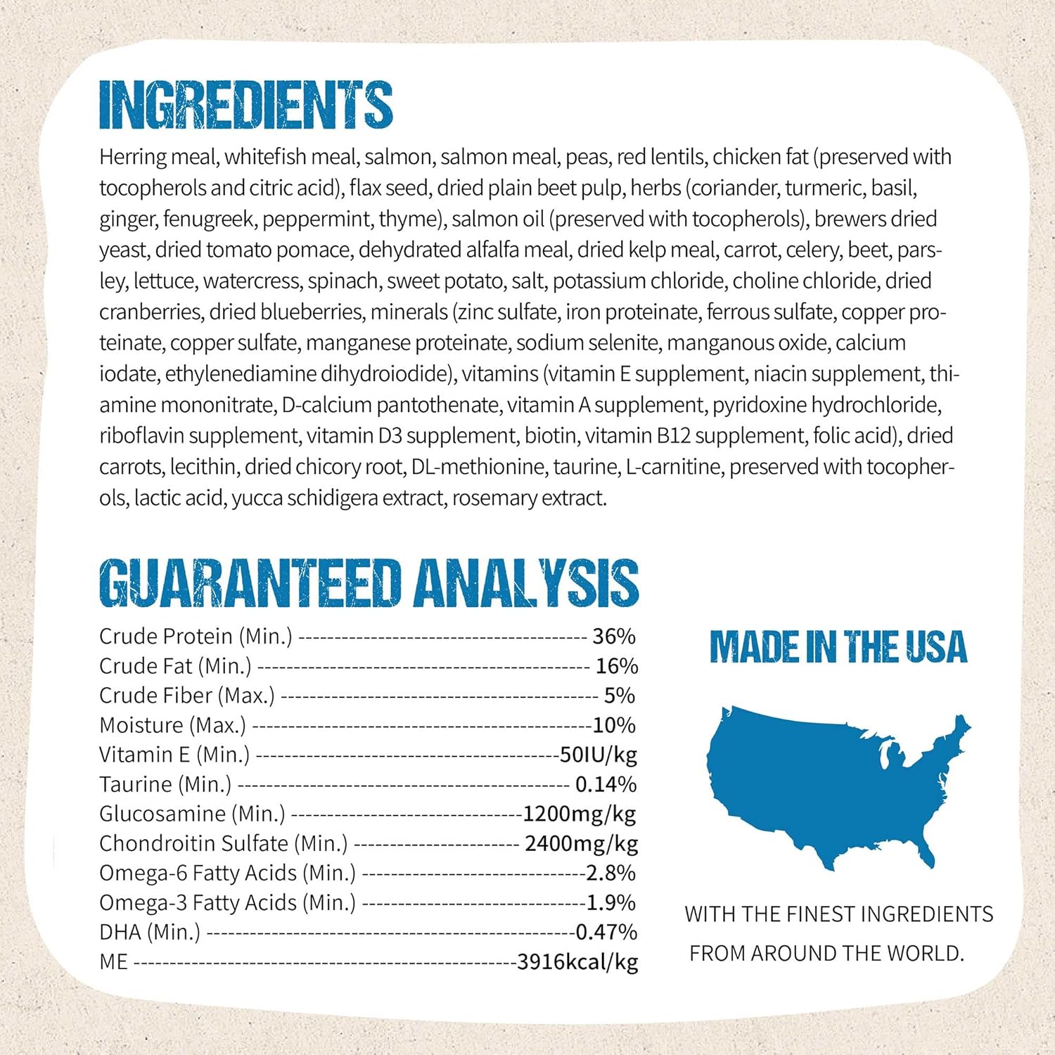 Herring meal, whitefish meal, salmon, salmon meal, peas, red lentils, chicken fat (preserved with tocopherols and citric acid), flax seed, dried plain beet pulp, herbs (coriander, turmeric, basil, ginger, fenugreek, peppermint, thyme), salmon oil (preserved with tocopherols), brewers dried yeast, dried tomato pomace, dehydrated alfalfa meal, dried kelp meal, carrot, celery, beet, parsley, lettuce, watercress, spinach, sweet potato, salt, potassium chloride, choline chloride, dried cranberries, dried blueberries, minerals (zinc sulfate, iron proteinate, ferrous sulfate, copper proteinate, copper sulfate, manganese proteinate, sodium selenite, manganous oxide, calcium iodate, ethylenediamine dihydroiodide), vitamins (vitamin E supplement, niacin supplement, thiamine mononitrate, D-calcium pantothenate, vitamin A supplement, pyridoxine hydrochloride, riboflavin supplement, vitamin D3 supplement, biotin, vitamin B12 supplement, folic acid), dried carrots, lecithin, dried chicory root, DL-methionine, taurine, L-carnitine, preserved with tocopherols, lactic acid, yucca schidigera extract, rosemary extract.