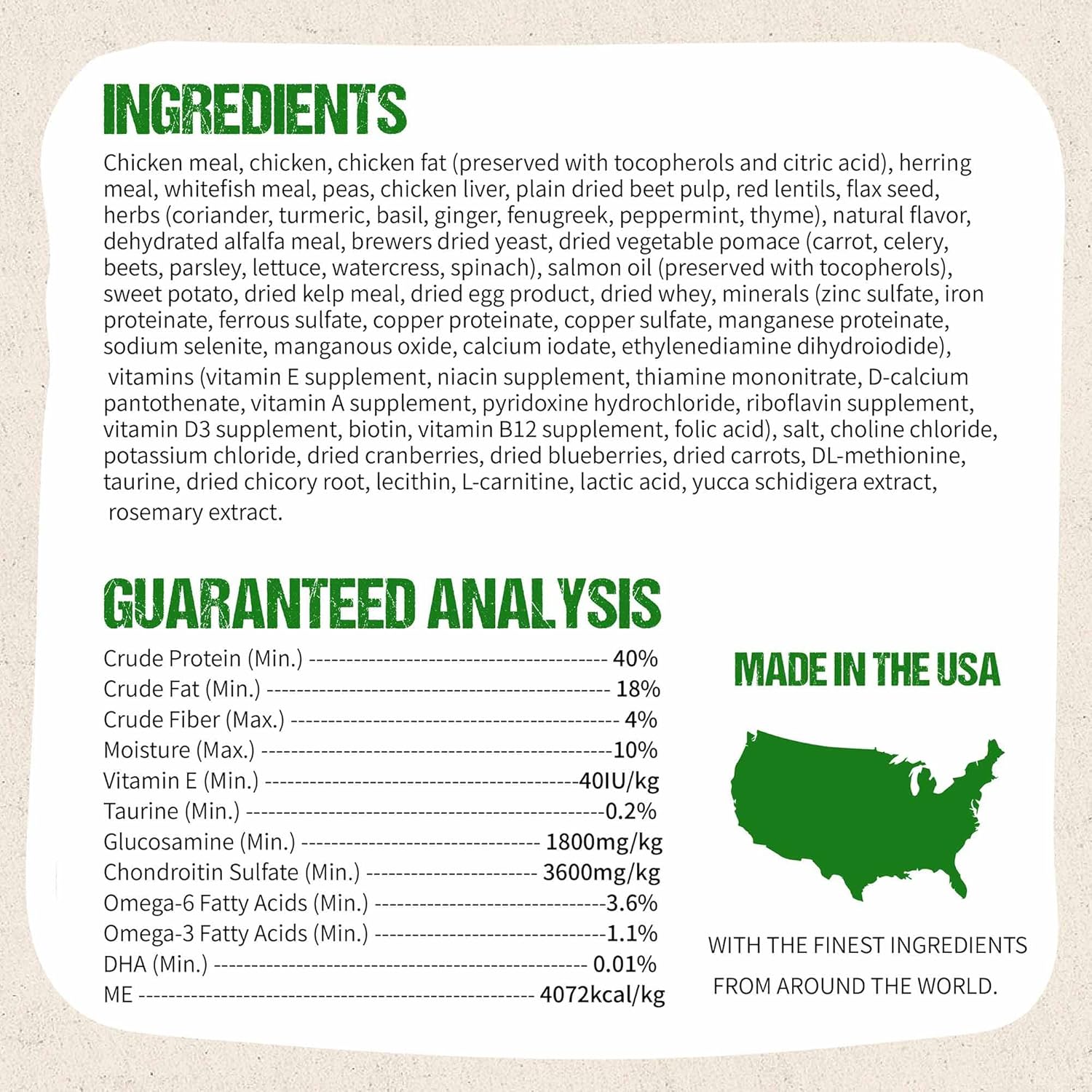 Chicken meal, chicken, chicken fat (preserved with tocopherols and citric acid), herring meal, whitefish meal, peas, chicken liver, plain dried beet pulp, red lentils, flax seed, herbs (coriander, turmeric, basil, ginger, fenugreek, peppermint, thyme), natural flavor, dehydrated alfalfa meal, brewers dried yeast, dried vegetable pomace (carrot, celery, beets, parsley, lettuce, watercress, spinach), salmon oil (preserved with tocopherols), sweet potato, dried kelp meal, dried egg product, dried whey, minerals (zinc sulfate, iron proteinate, ferrous sulfate, copper proteinate, copper sulfate, manganese proteinate, sodium selenite, manganous oxide, calcium iodate, ethylenediamine dihydroiodide), vitamins (vitamin E supplement, niacin supplement, thiamine mononitrate, D-calcium pantothenate, vitamin A supplement, pyridoxine hydrochloride, riboflavin supplement, vitamin D3 supplement, biotin, vitamin B12 supplement, folic acid), salt, choline chloride, potassium chloride, dried cranberries, dried blueberries, dried carrots, DL-methionine, taurine, dried chicory root, lecithin, L-carnitine, lactic acid, yucca schidigera extract, rosemary extract.