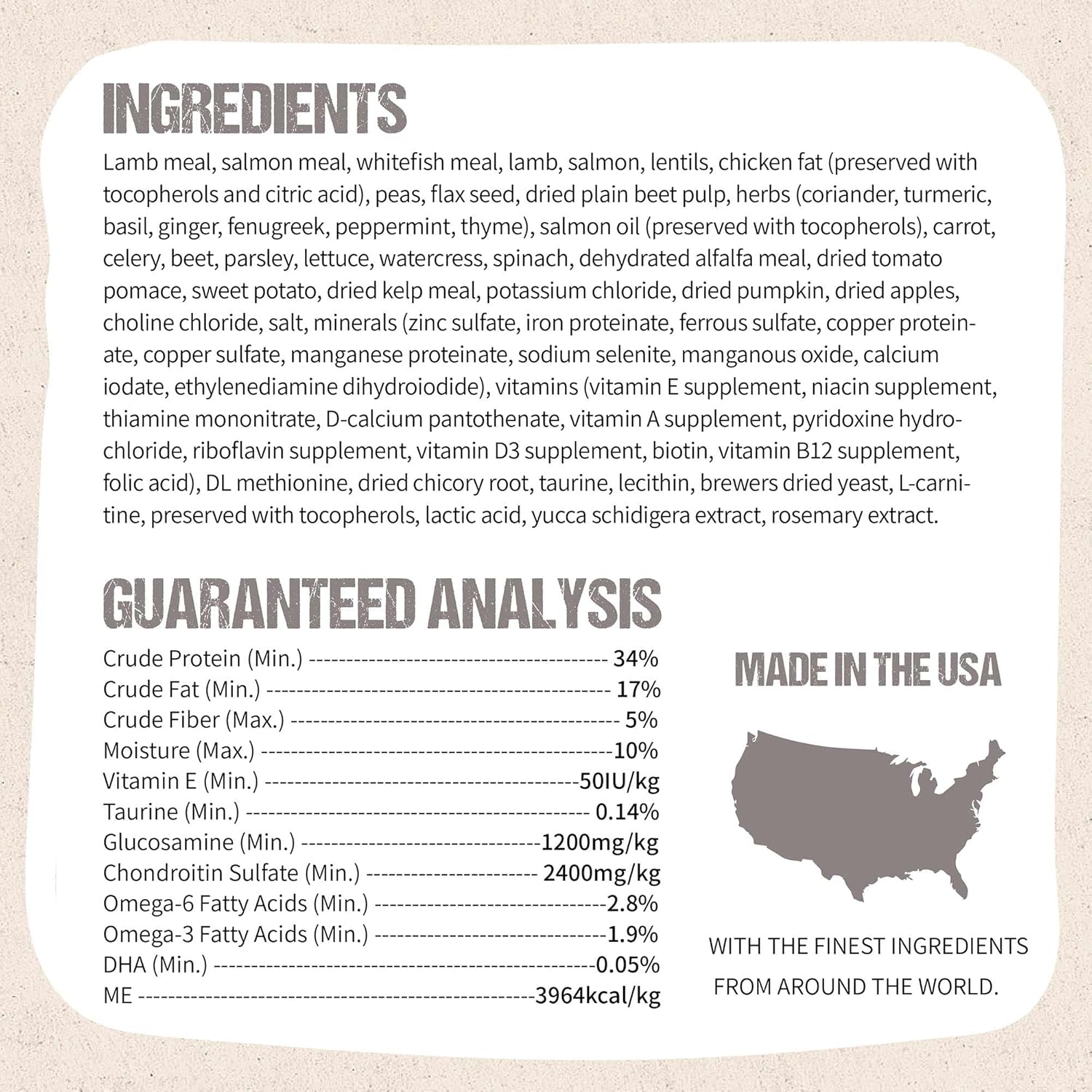 Lamb meal, salmon meal, whitefish meal, lamb, salmon, lentils, chicken fat (preserved with tocopherols and citric acid), peas, flax seed, dried plain beet pulp, herbs (coriander, turmeric, basil, ginger, fenugreek, peppermint, thyme), salmon oil (preserved with tocopherols), carrot, celery, beet, parsley, lettuce, watercress, spinach, dehydrated alfalfa meal, dried tomato pomace, sweet potato, dried kelp meal, potassium chloride, dried pumpkin, dried apples, choline chloride, salt, minerals (zinc sulfate, iron proteinate, ferrous sulfate, copper proteinate, copper sulfate, manganese proteinate, sodium selenite, manganous oxide, calcium iodate, ethylenediamine dihydroiodide), vitamins (vitamin E supplement, niacin supplement, thiamine mononitrate, D-calcium pantothenate, vitamin A supplement, pyridoxine hydrochloride, riboflavin supplement, vitamin D3 supplement, biotin, vitamin B12 supplement, folic acid), DL-methionine, dried chicory root, taurine, lecithin, brewers dried yeast, L-carnitine, preserved with tocopherols, lactic acid, yucca schidigera extract, rosemary extract.