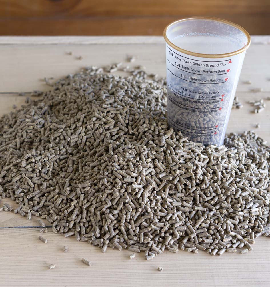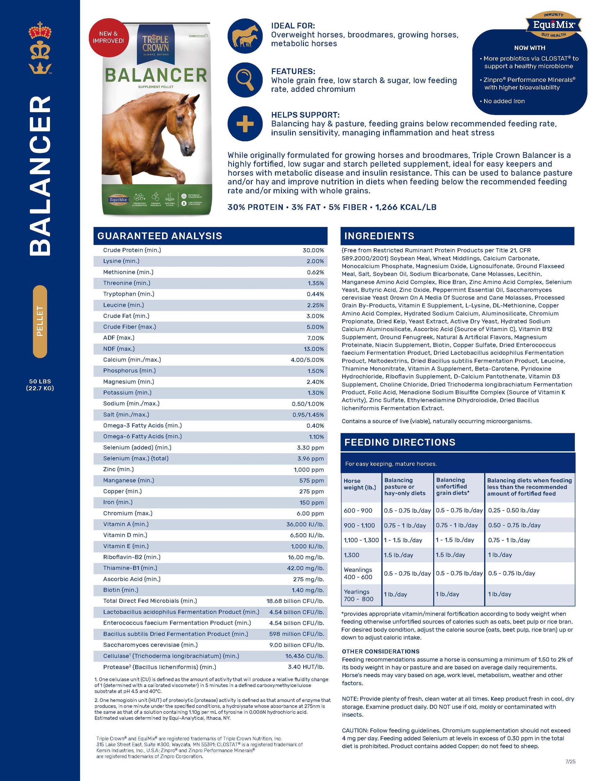 While originally formulated for growing horses and broodmares, Triple Crown Balancer is a highly fortified, low sugar and starch pelleted supplement, ideal for easy keepers and horses with metabolic disease and insulin resistance. This can be used to balance pasture and/or hay and improve nutrition in diets when feeding below the recommended feeding rate and/or mixing with whole grains.