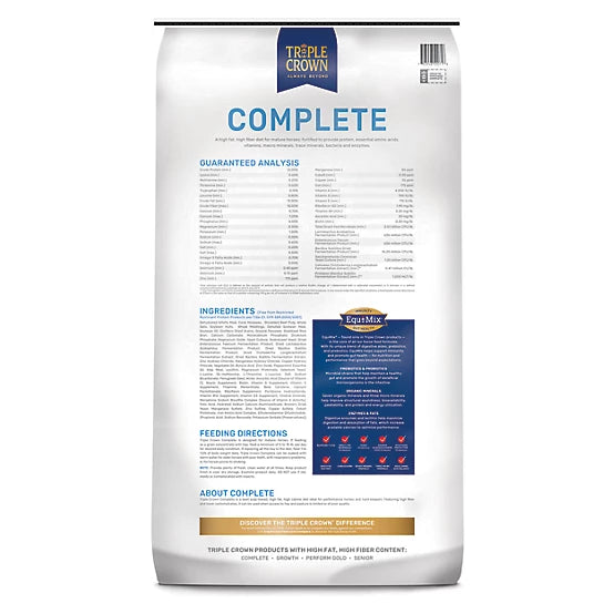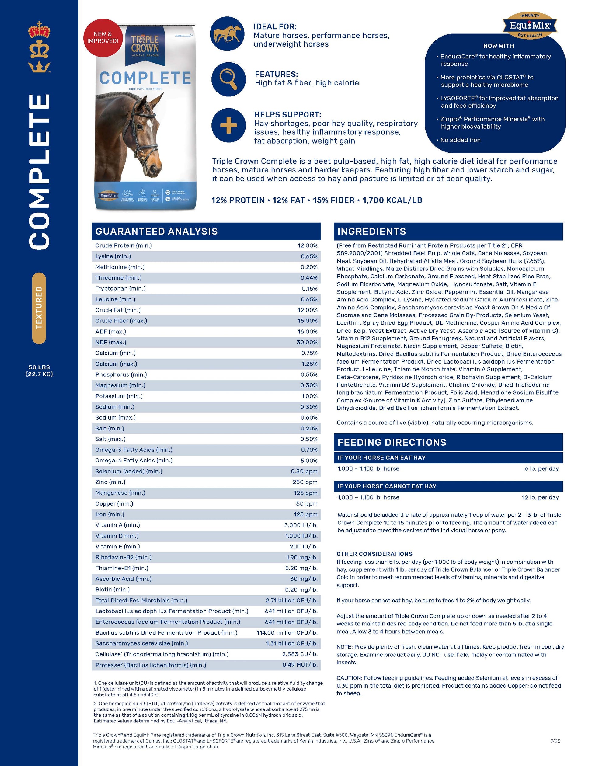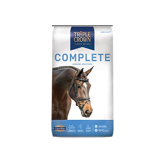 Triple Crown Complete is a beet pulp-based, high fat, high calorie diet ideal for performance horses, mature horses and harder keepers. Featuring high fiber and lower starch and sugar, it can be used when access to hay and pasture is limited or of poor quality.