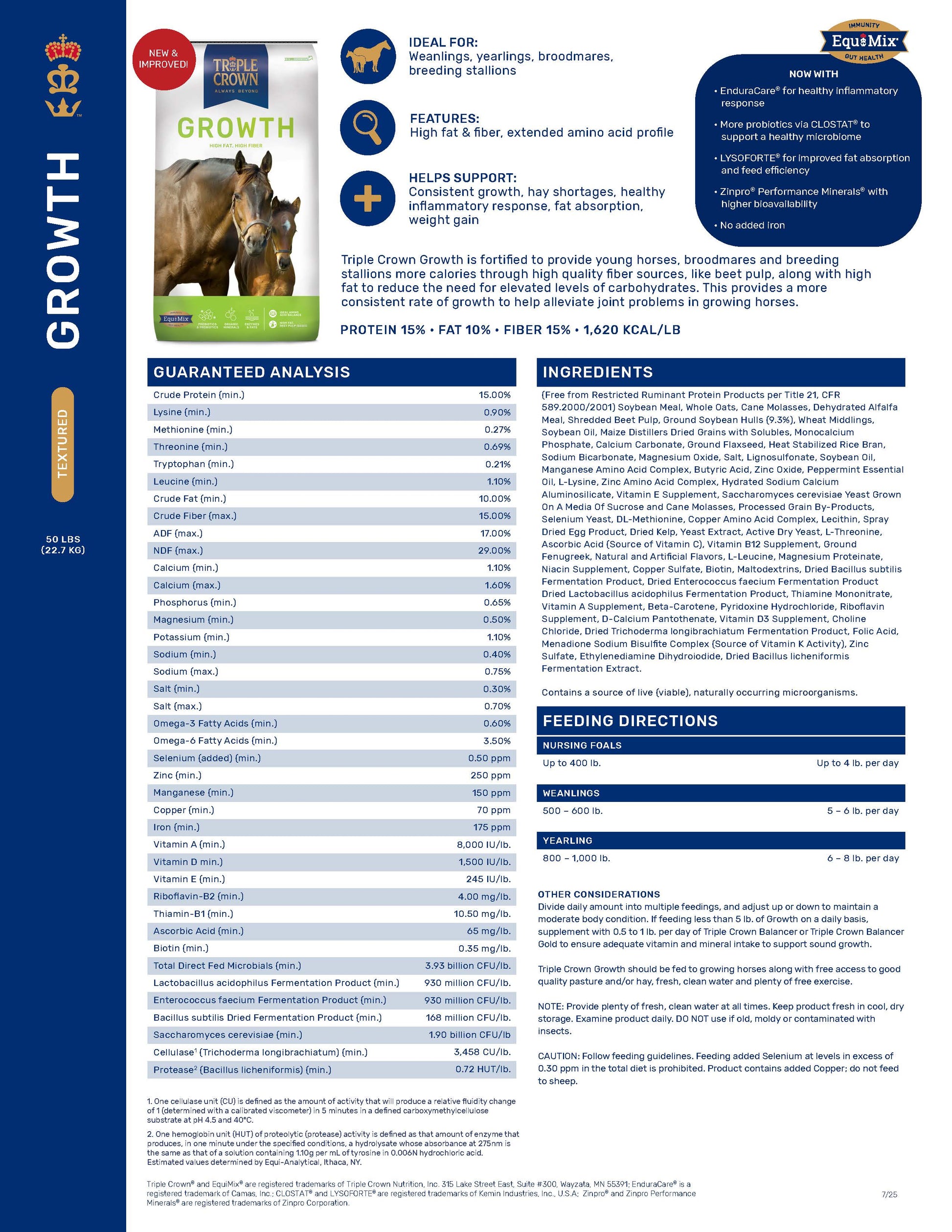 Triple Crown Growth is fortified to provide young horses, broodmares and breeding stallions more calories through high quality fiber sources, like beet pulp, along with high fat to reduce the need for elevated levels of carbohydrates. This provides a more consistent rate of growth to help alleviate joint problems in growing horses.