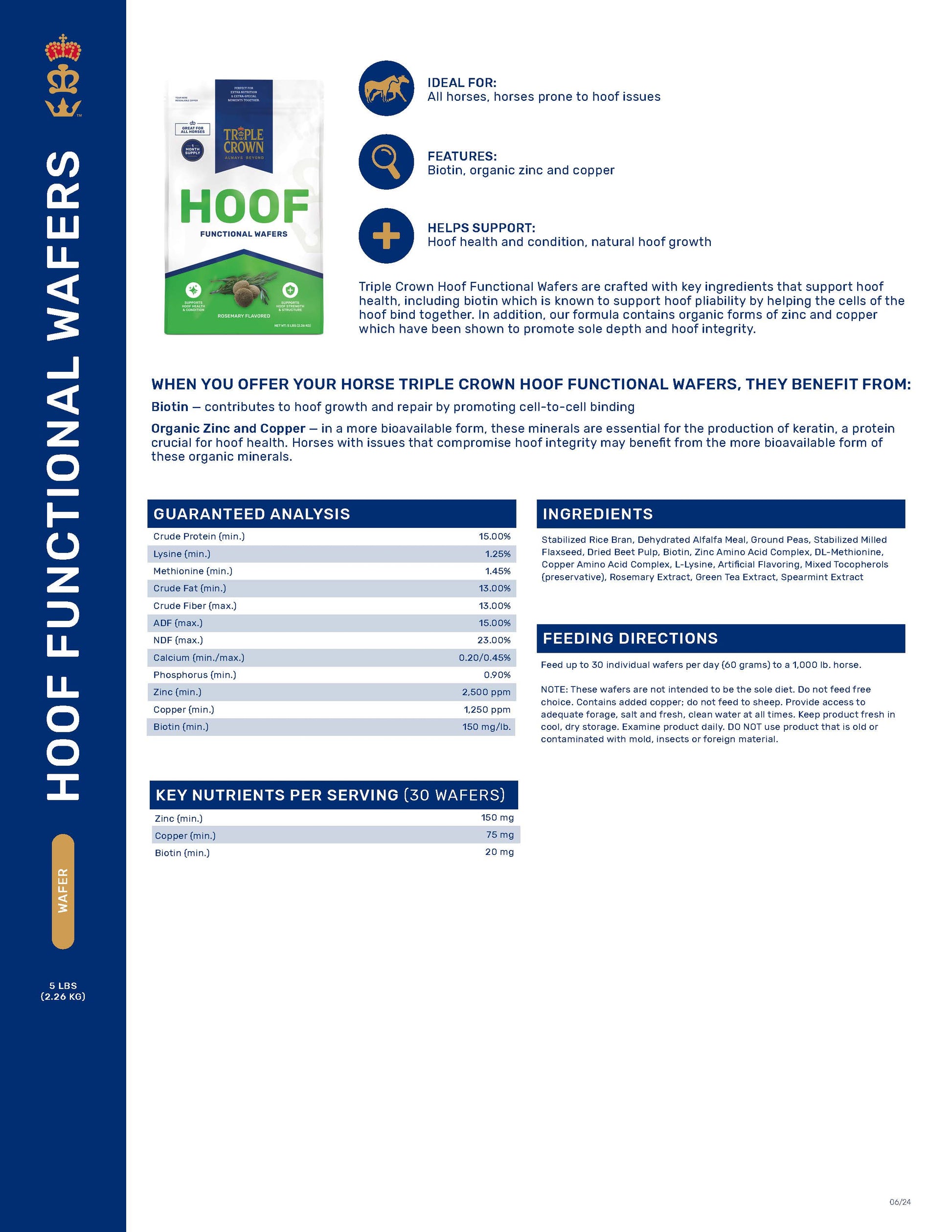 Triple Crown Hoof Functional Wafers are crafted with key ingredients that support hoof health, including biotin which is known to support hoof pliability by helping the cells of the hoof bind together. In addition, our formula contains organic forms of zinc and copper which have been shown to promote sole depth and hoof integrity.