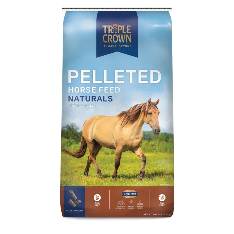 Triple Crown Naturals Pelleted Horse Feed features a nutritious, corn free and soybean free recipe with no molasses that supplements its essential goodness with EquiMix®, a unique combination of advanced supplements formulated to keep your horse at its healthiest.