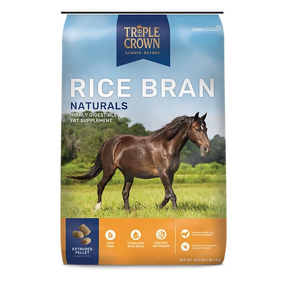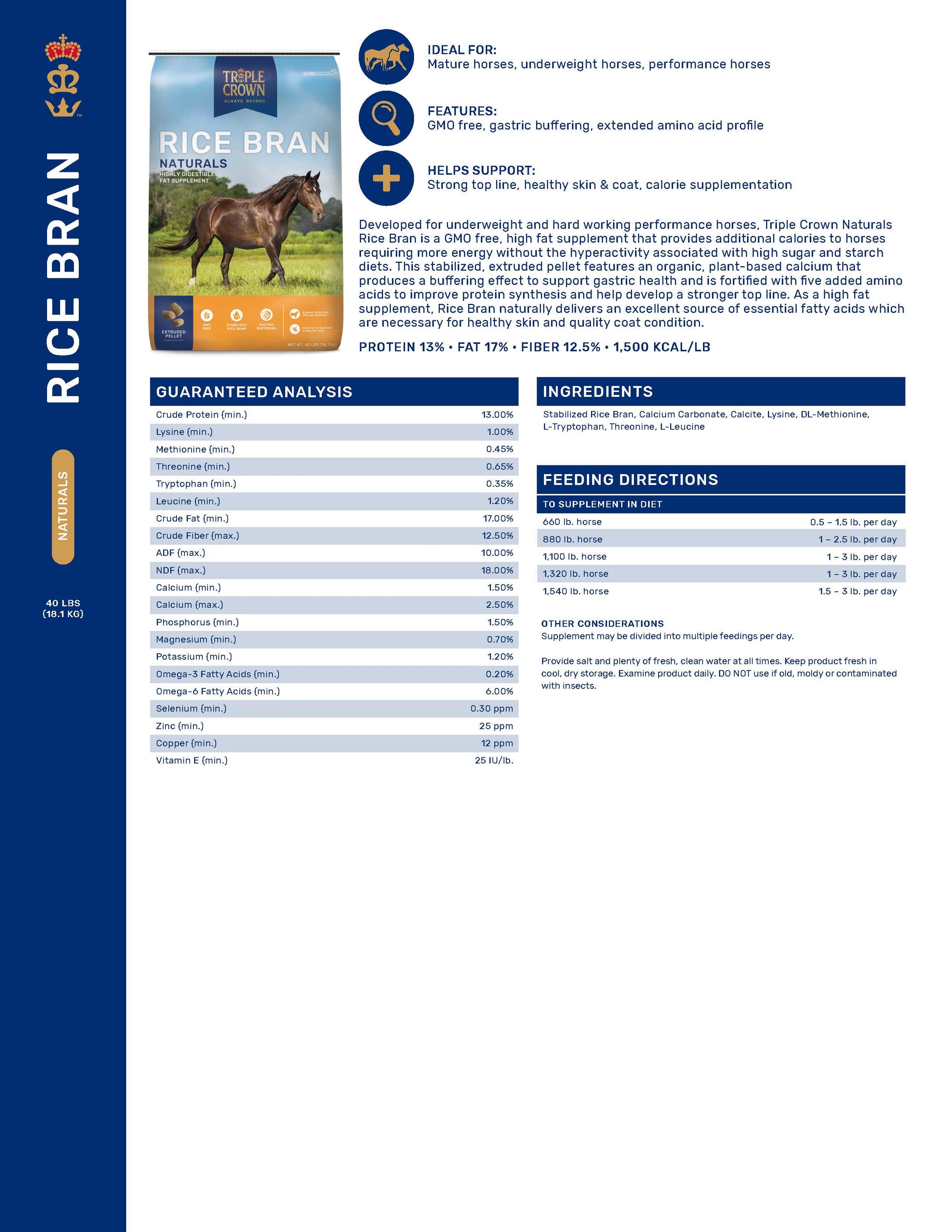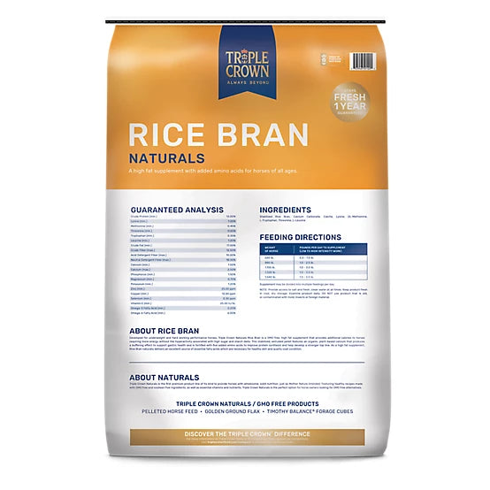 Developed for underweight and hard working performance horses, Triple Crown Naturals Rice Bran is a GMO free, high fat supplement that provides additional calories to horses requiring more energy without the hyperactivity associated with high sugar and starch diets. This stabilized, extruded pellet features an organic, plant-based calcium that produces a buffering effect to support gastric health and is fortified with five added amino acids to improve protein synthesis and help develop a stronger top line. As a high fat supplement, Rice Bran naturally delivers an excellent source of essential fatty acids which are necessary for healthy skin and quality coat condition.