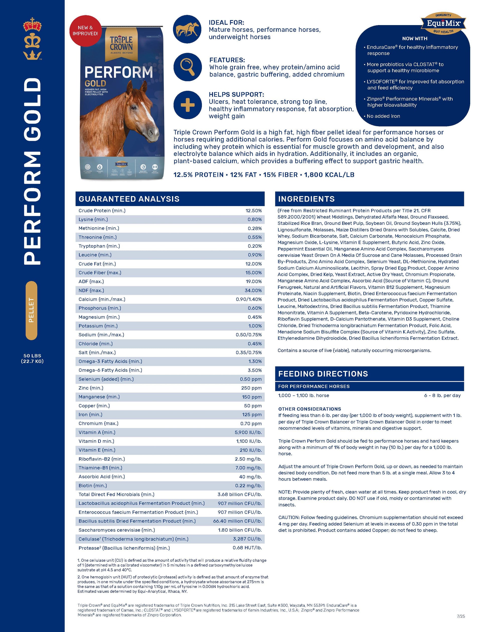 Triple Crown Perform Gold is a high fat, high fiber pellet ideal for performance horses or horses requiring additional calories. Perform Gold focuses on amino acid balance by including whey protein which is essential for muscle growth and development, and also electrolyte balance which aids in hydration. Additionally, it includes an organic, plant-based calcium, which provides a buffering effect to support gastric health.