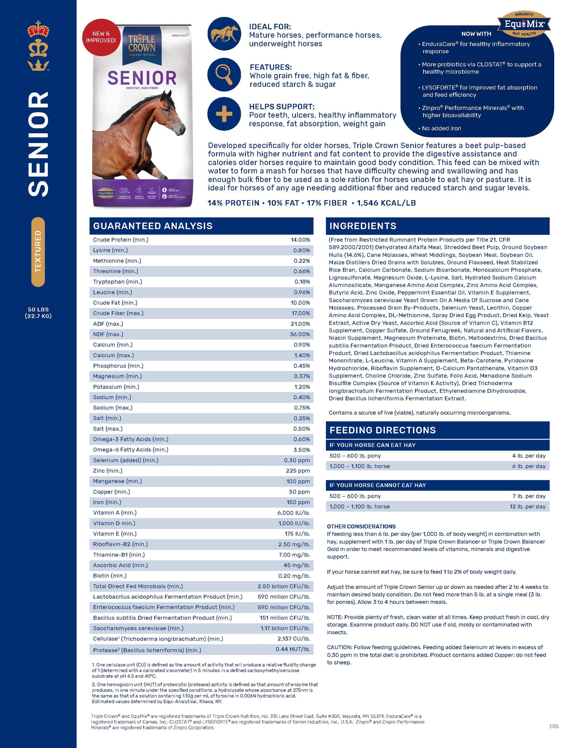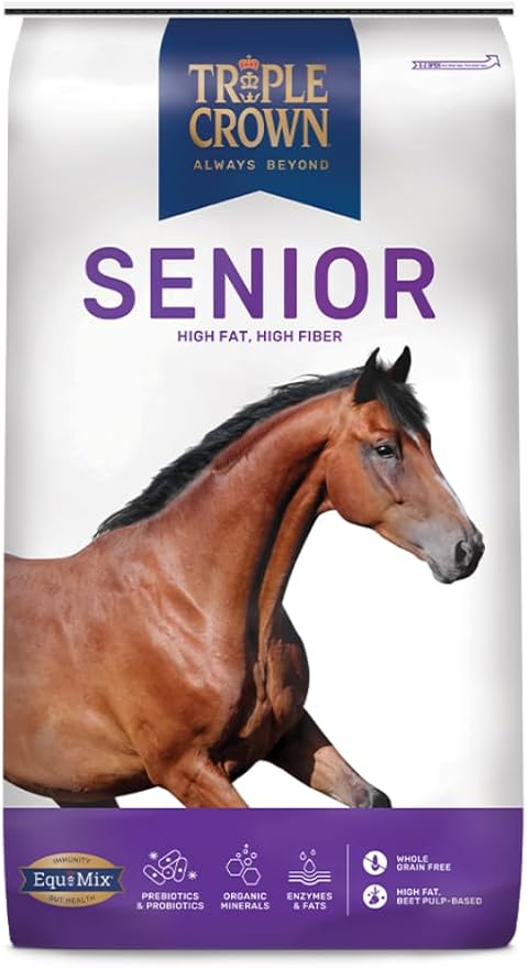 Developed specifically for older horses, Triple Crown Senior features a beet pulp-based formula with higher nutrient and fat content to provide the digestive assistance and calories older horses require to maintain good body condition. This feed can be mixed with water to form a mash for horses that have difficulty chewing and swallowing and has enough bulk fiber to be used as a sole ration for horses unable to eat hay or pasture. It is SENIOR ideal for horses of any age needing additional fiber and reduced starch and sugar levels.