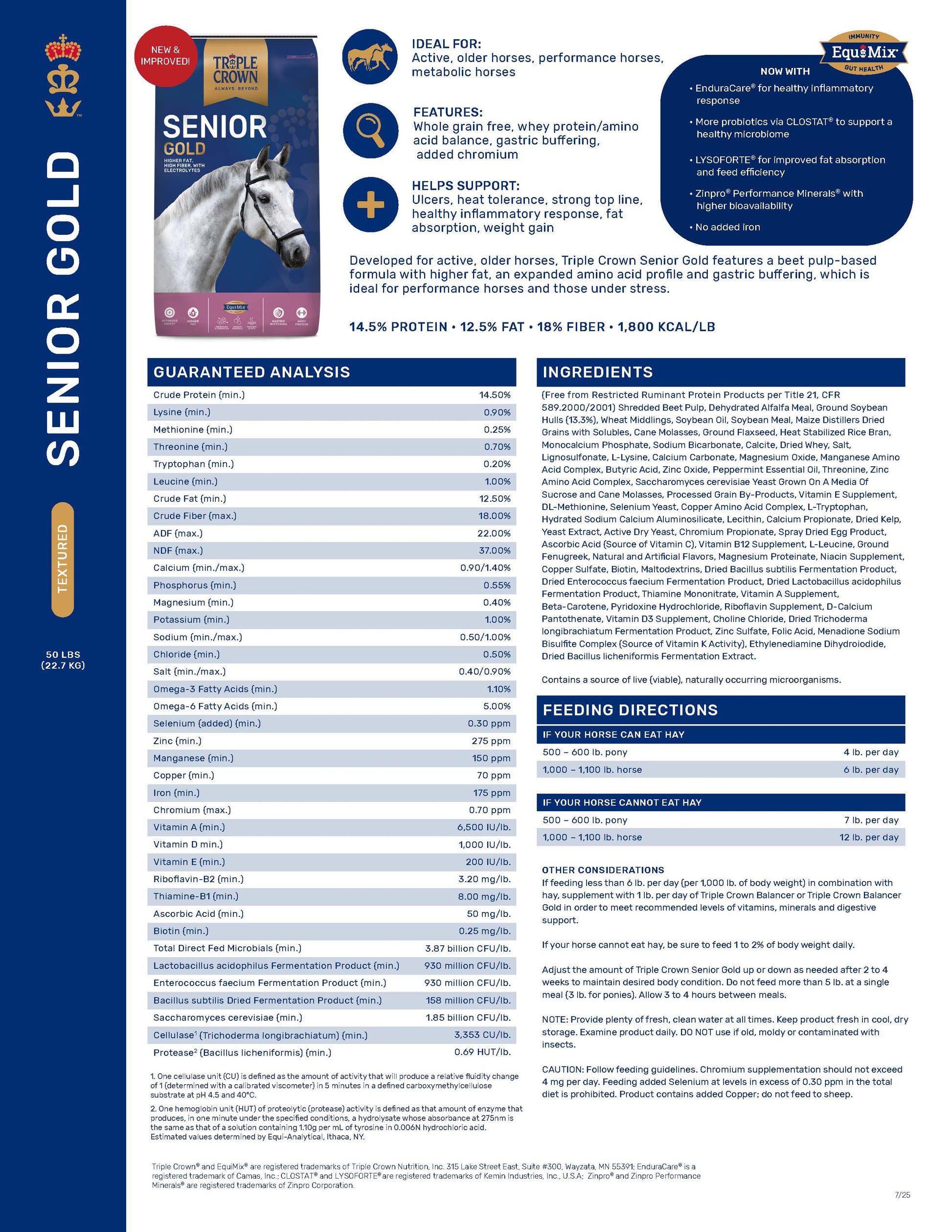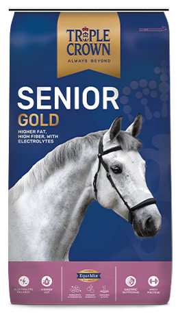 Developed for active, older horses, Triple Crown Senior Gold features a beet pulp-based formula with higher fat, an expanded amino acid profile and gastric buffering, which is ideal for performance horses and those under stress.