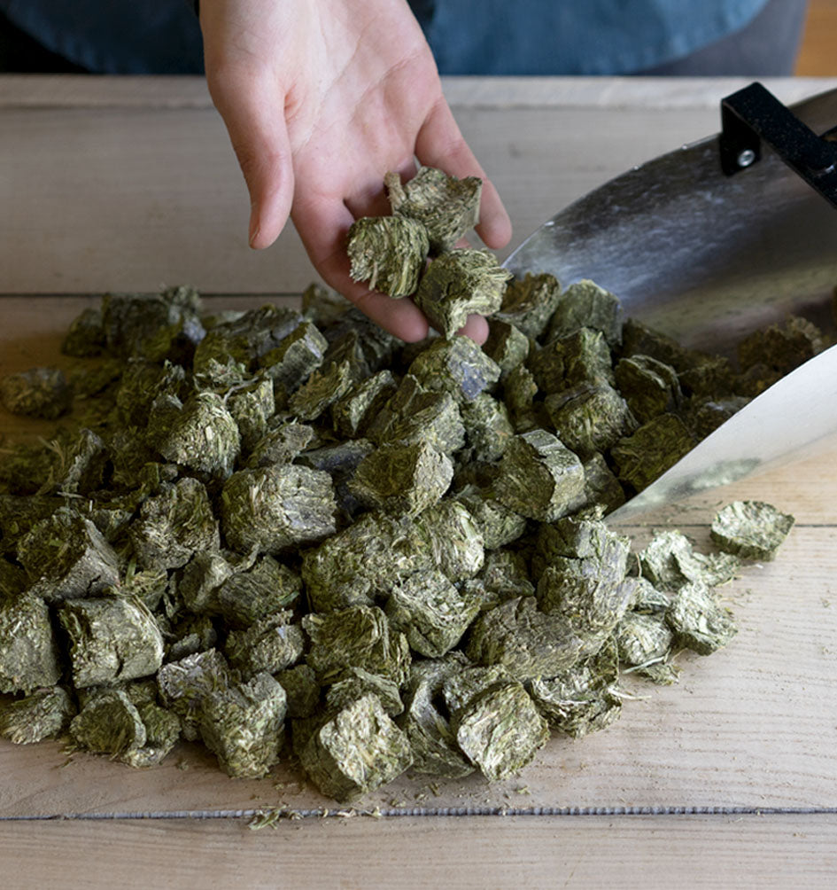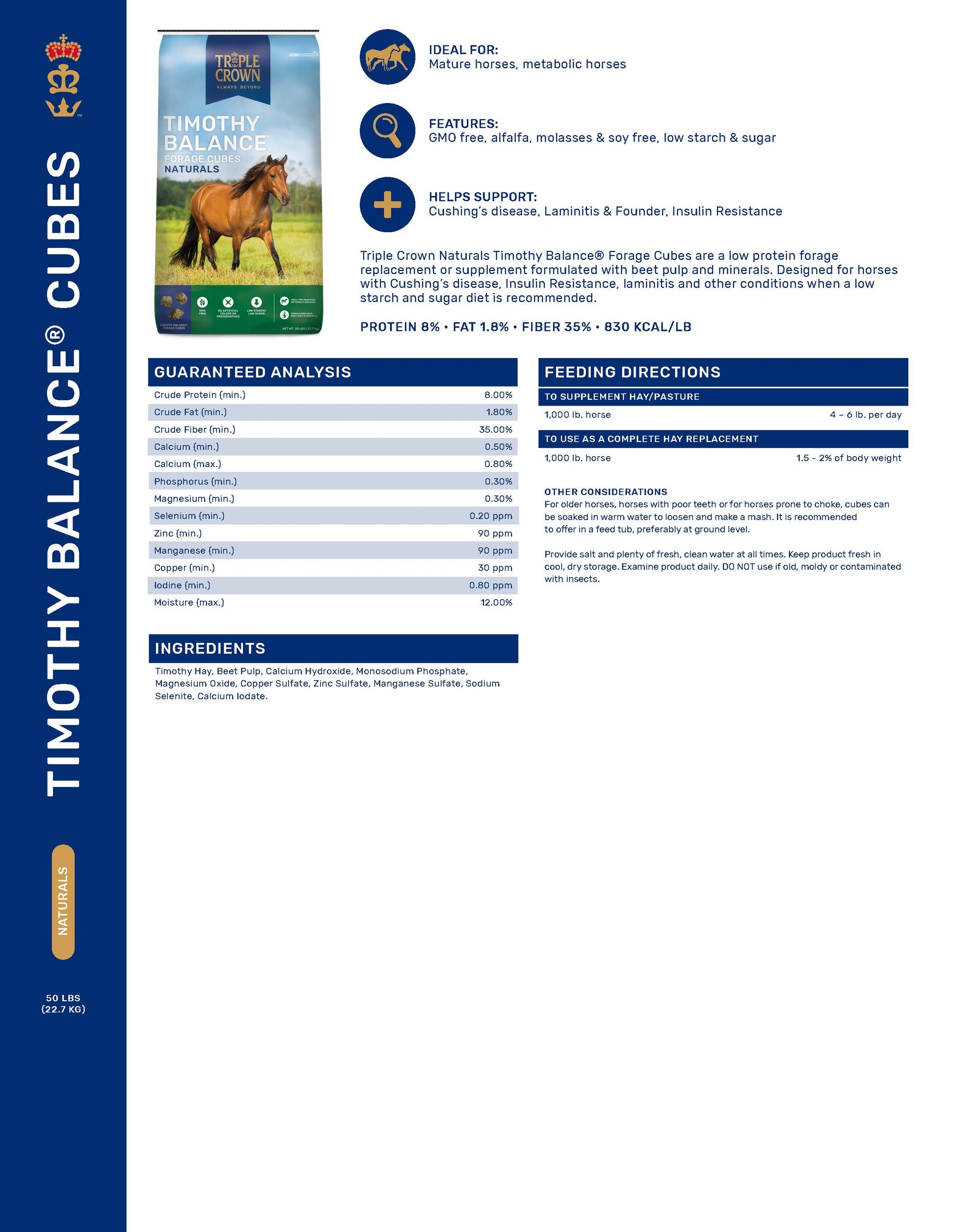 Triple Crown Naturals Timothy Balance® Forage Cubes are a low protein forage replacement or supplement formulated with beet pulp and minerals. Designed for horses with Cushing’s disease, Insulin Resistance, laminitis and other conditions when a low starch and sugar diet is recommended.